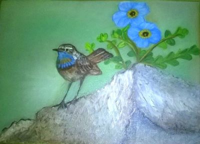 «L’immagine è dell’autrice, "Pettazzurro", olio su cartone telato.»
